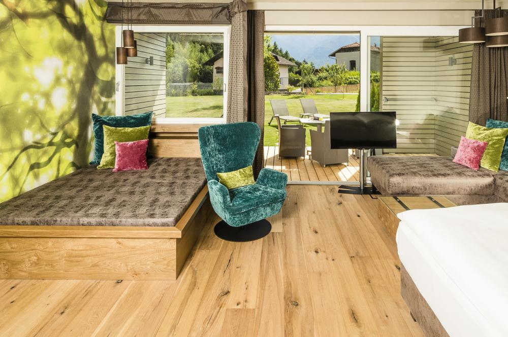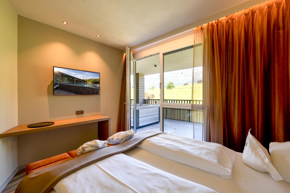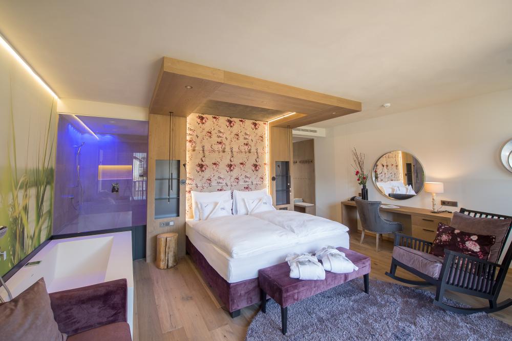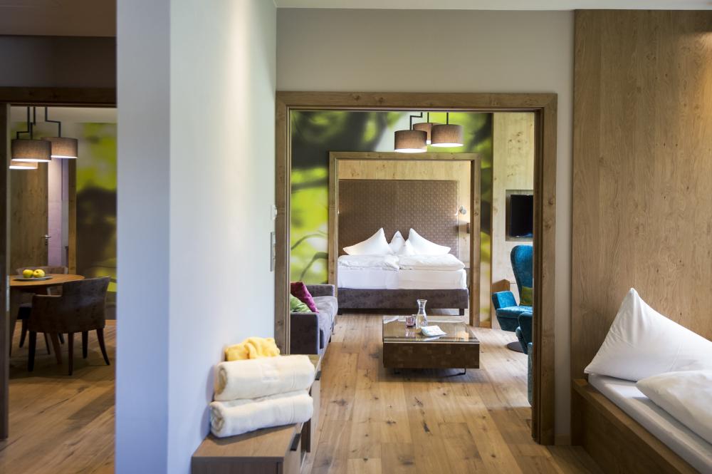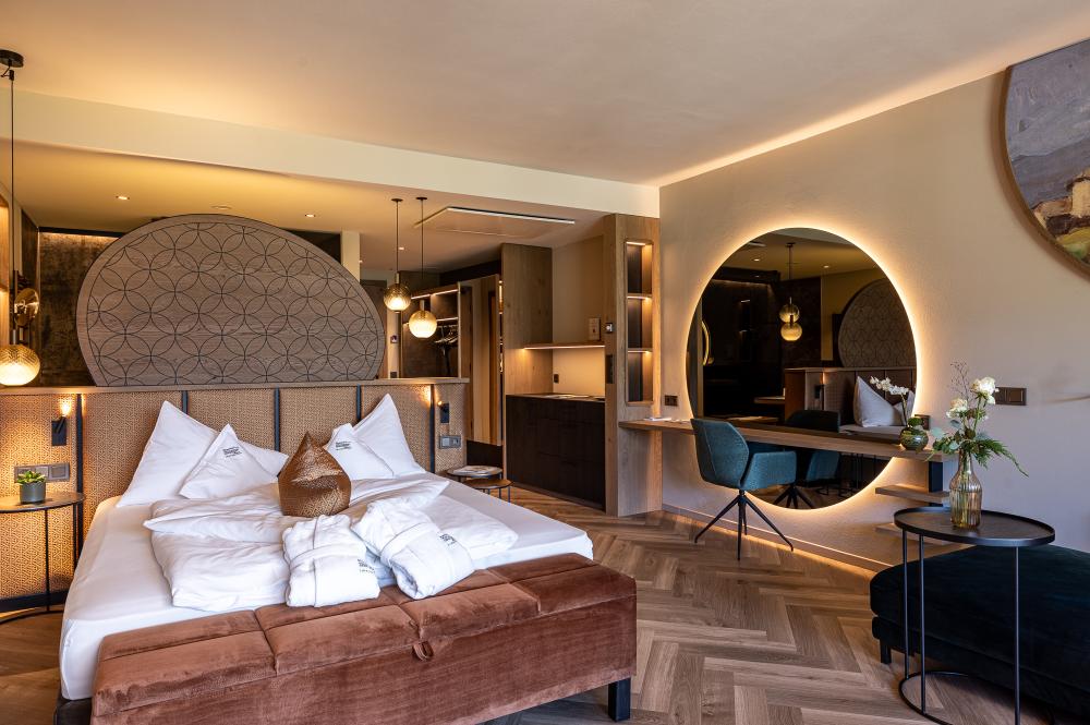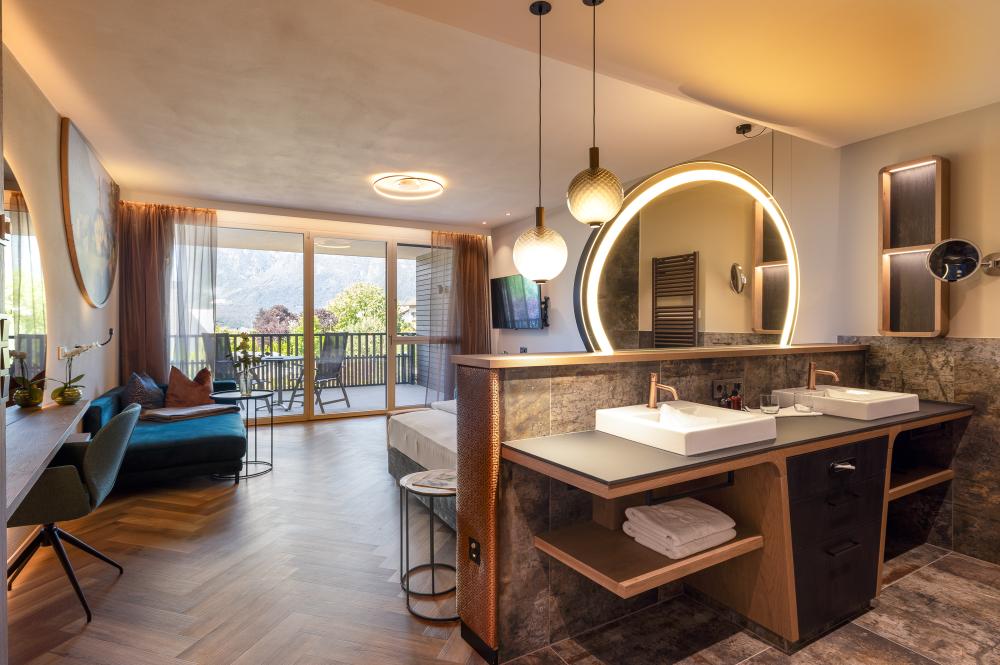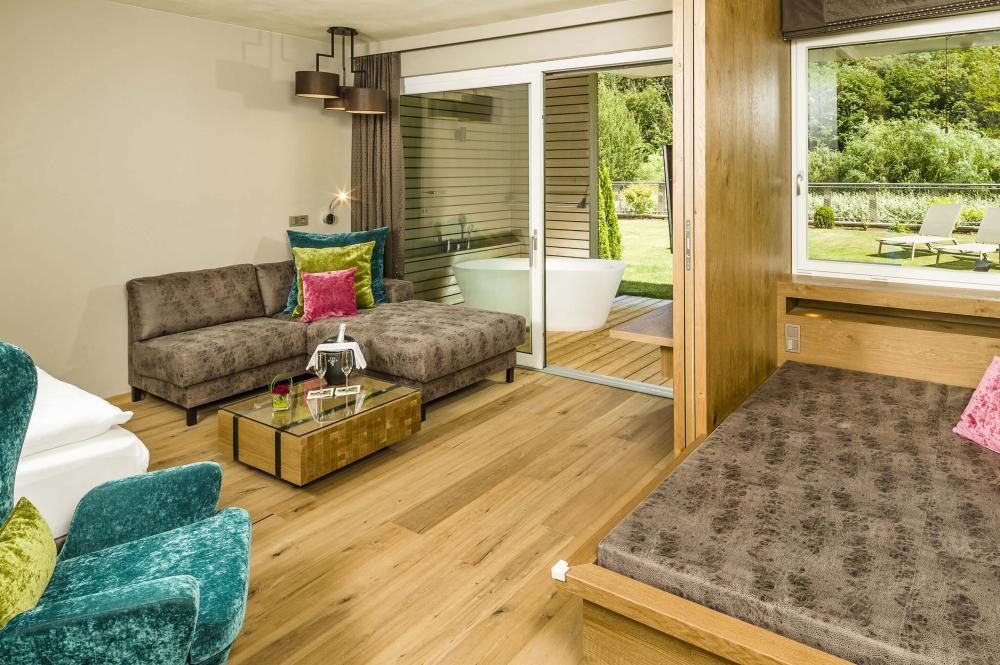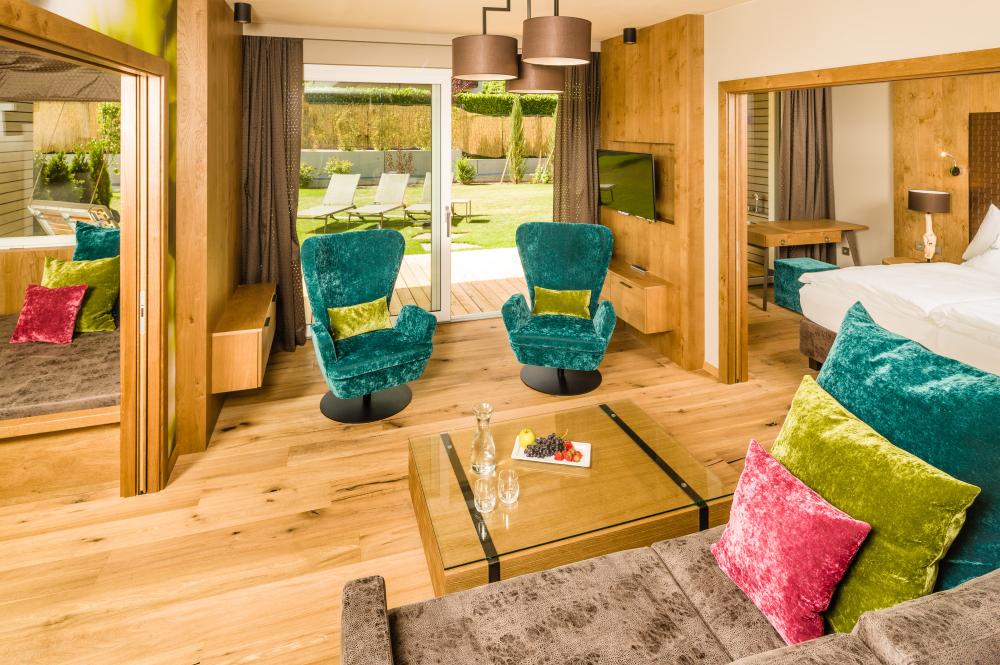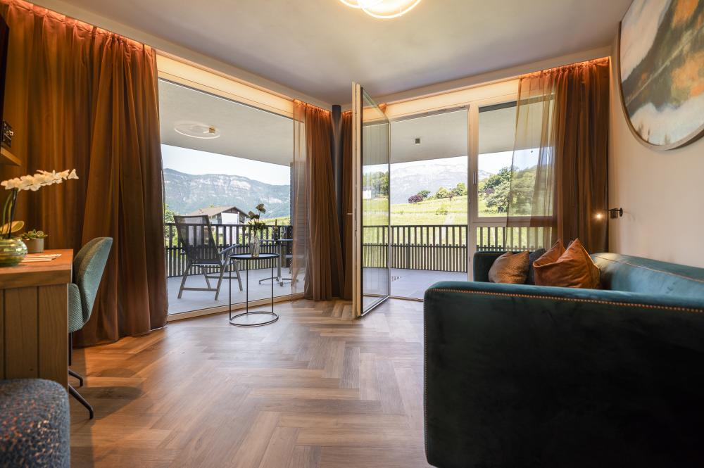 Moderne Juniorsuite in beruhigenden Naturfarben und heimischer Wildeiche mit Eichenholzboden. Harmonisches, naturbelassenes Design mit Klimaanlage, Minibar, SAT-TV, Telefon, Radiowecker, Zimmersafe und WLAN. Kuscheliges Kingsize-Bett und gemütlicher, nicht abgetrennter Wohnbereich mit Schlafcouch. Großzügiges, offenes Badezimmer mit geräumiger Regendusche, getrenntem WC und Bidet, komfortablem Doppelwaschtisch mit Föhn und Kosmetikspiegel. Großer Sonnenbalkon mit Blick auf die Gärten oder das Mendelgebirge. 2 Suiten barrierefrei.