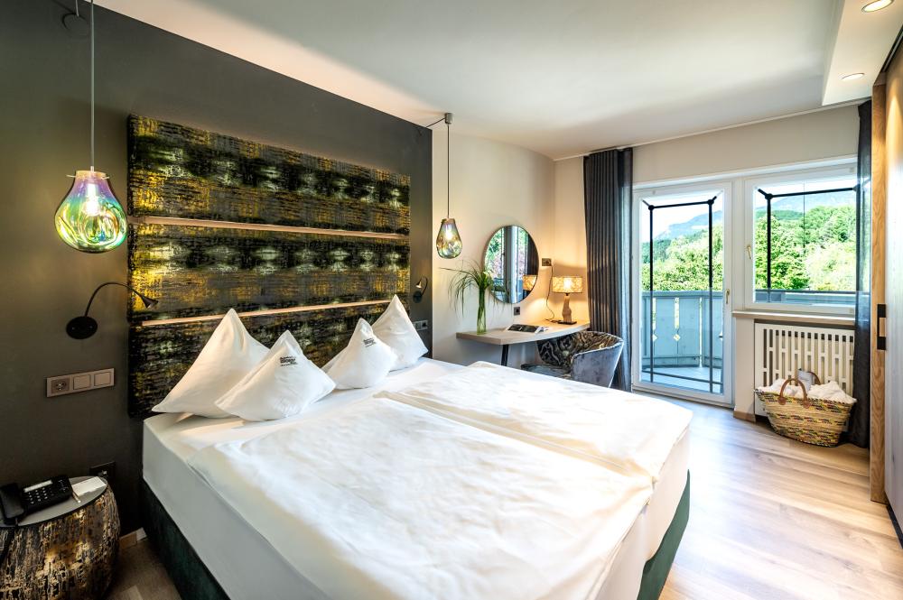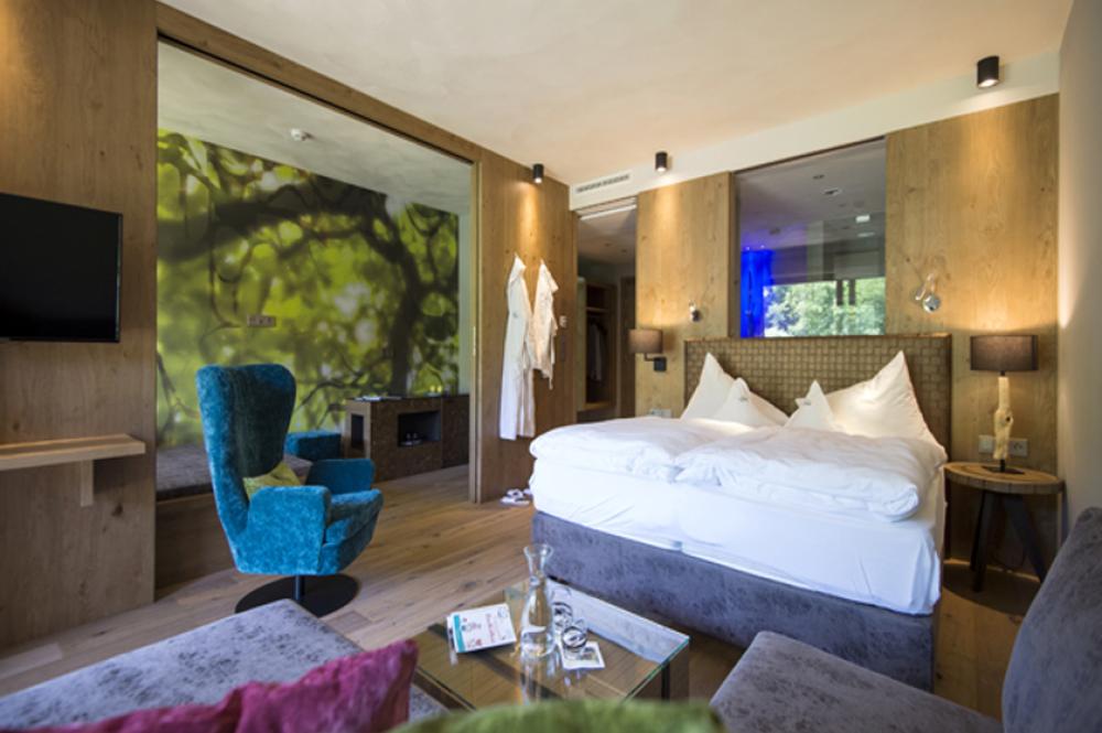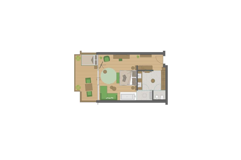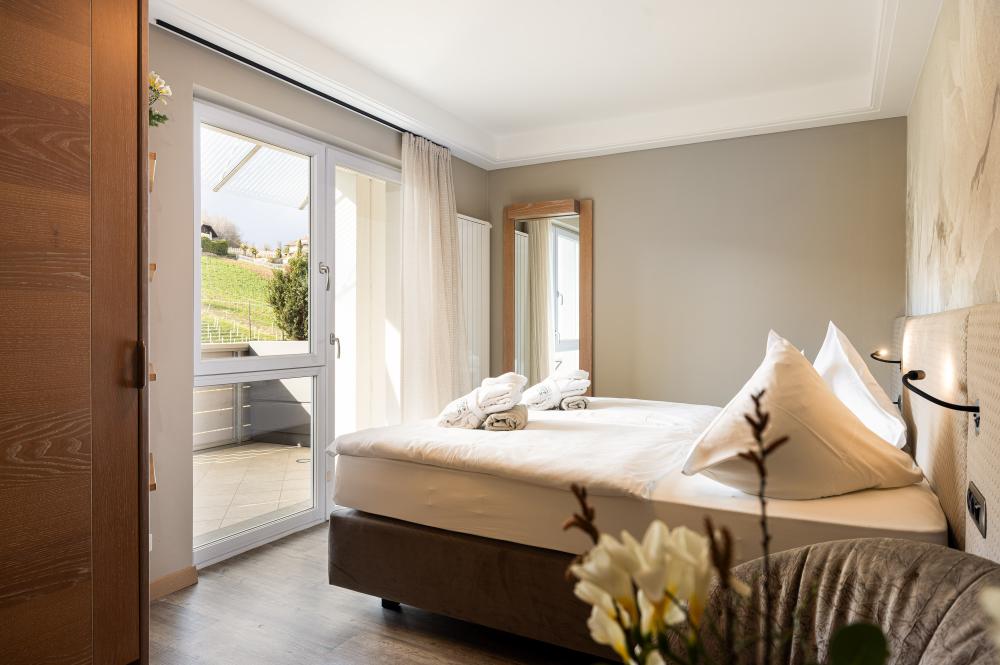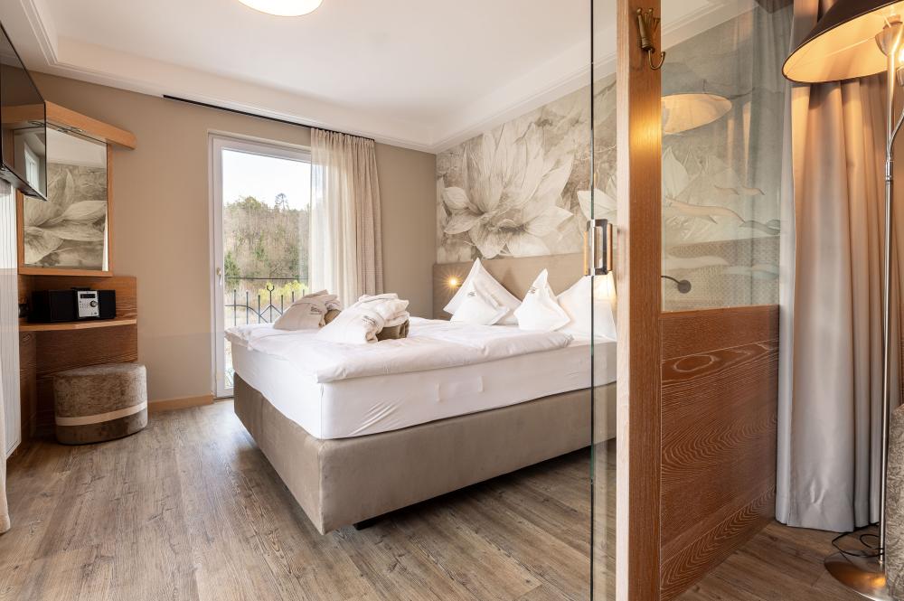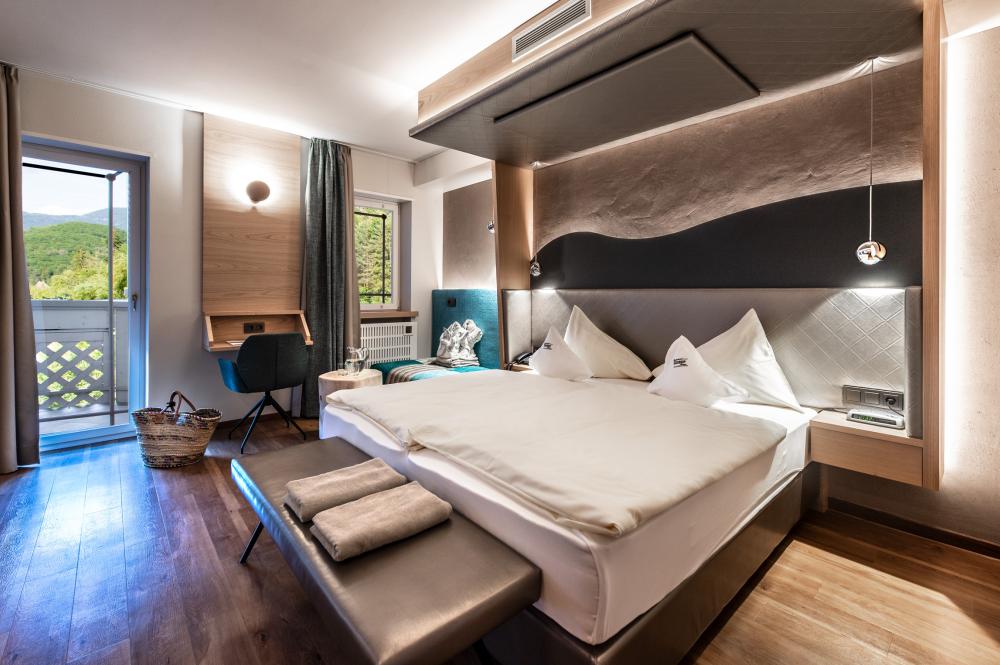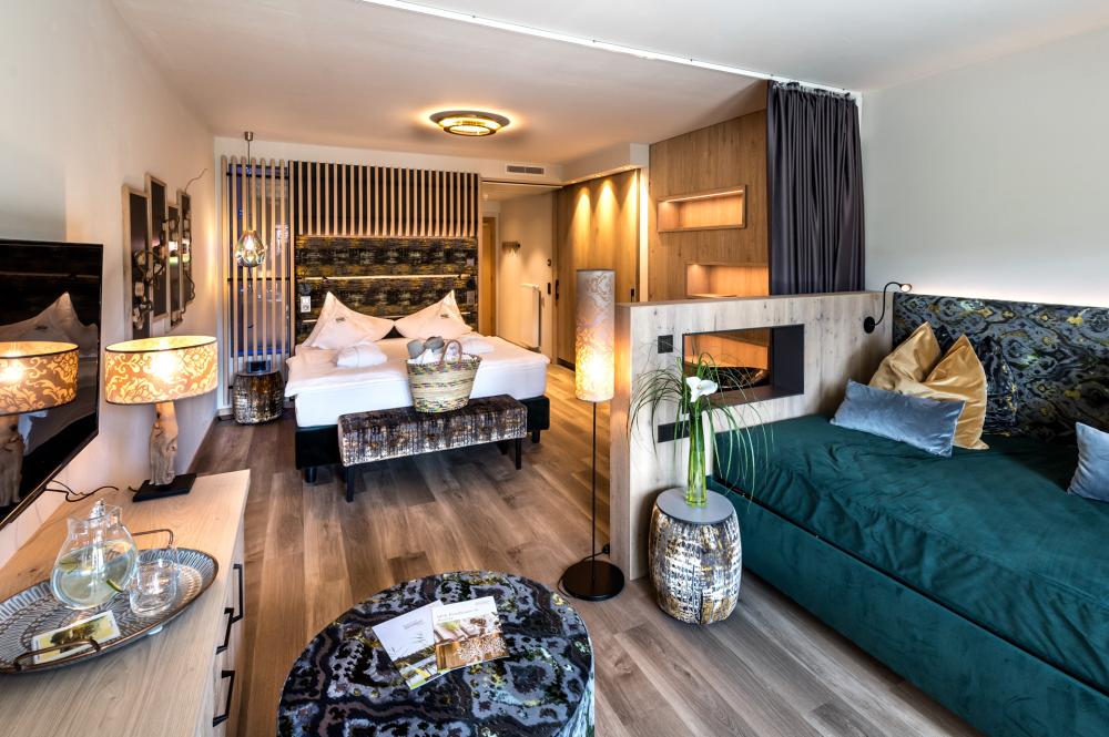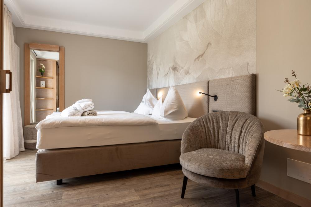 Moderne Juniorsuite in beruhigenden Naturfarben und heimischer Wildeiche mit Eichenholzboden. Harmonisches, naturbelassenes Design mit Klimaanlage, Minibar, SAT-TV, Telefon, Radiowecker, Zimmersafe und WLAN. Kuscheliges Kingsize-Bett und gemütlicher, nicht abgetrennter Wohnbereich mit Schlafcouch. Großzügiges, offenes Badezimmer mit geräumiger Regendusche, getrenntem WC und Bidet, komfortablem Doppelwaschtisch mit Föhn und Kosmetikspiegel. Großer Sonnenbalkon mit Blick auf die Gärten oder das Mendelgebirge. 2 Suiten barrierefrei.