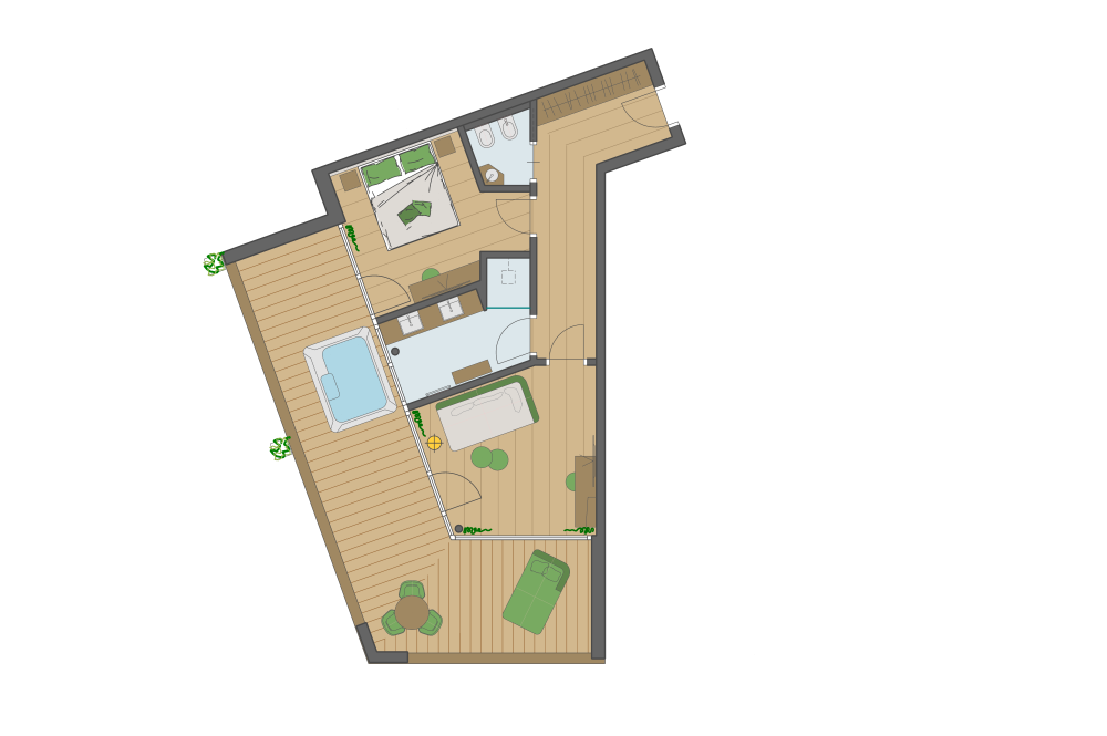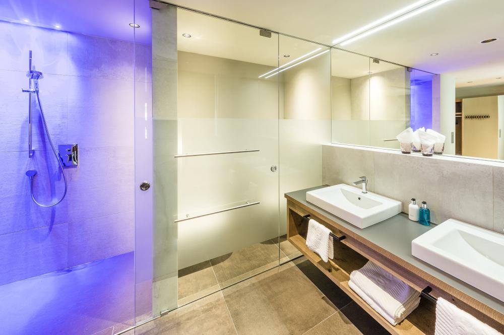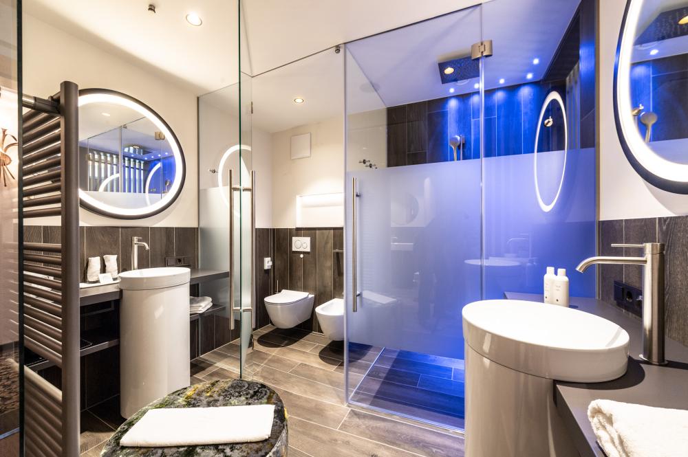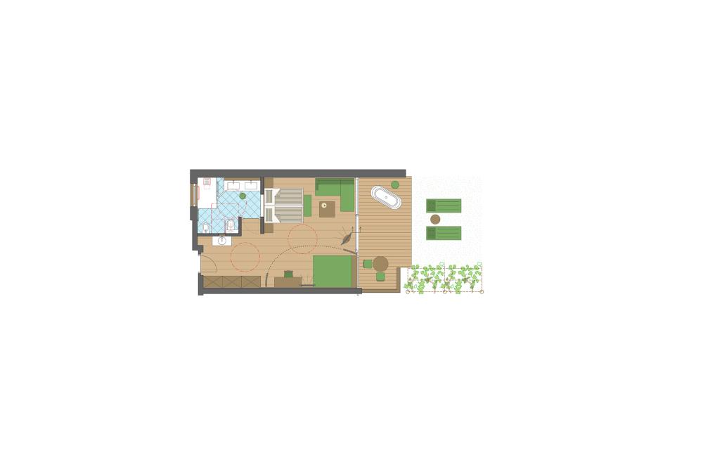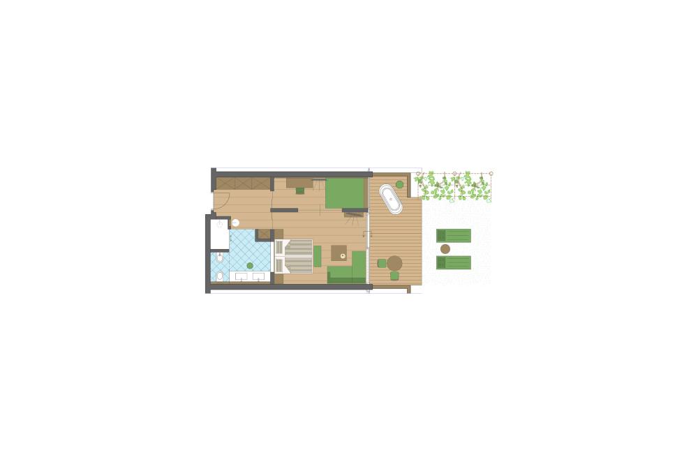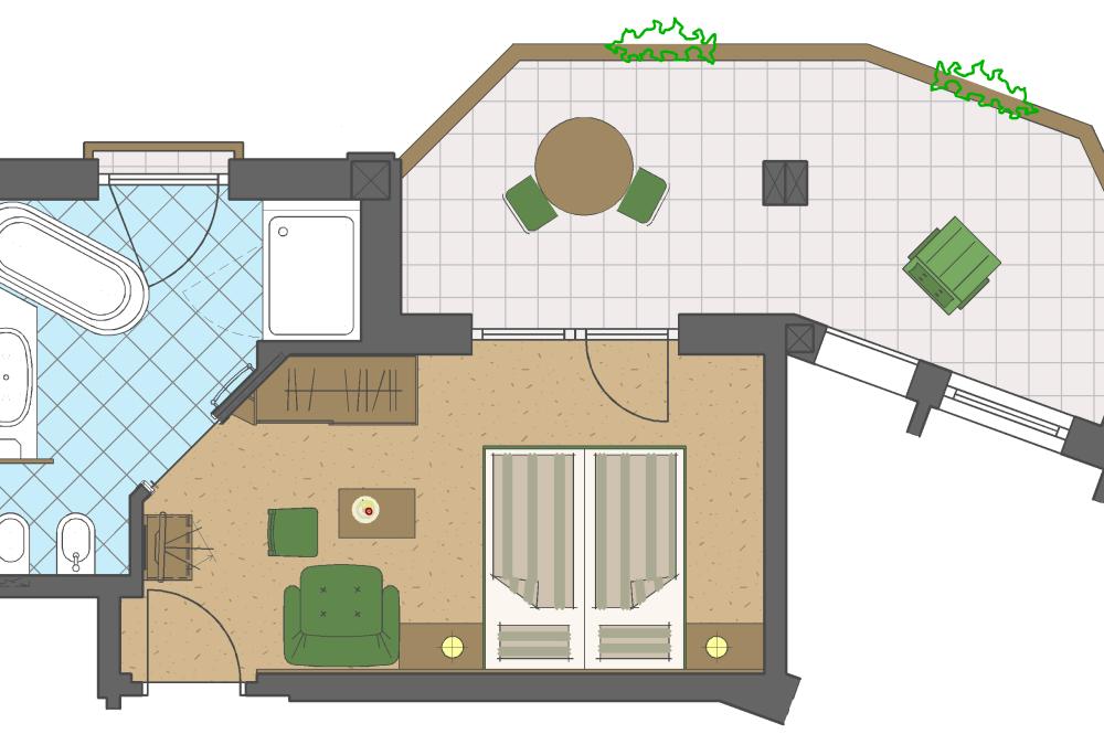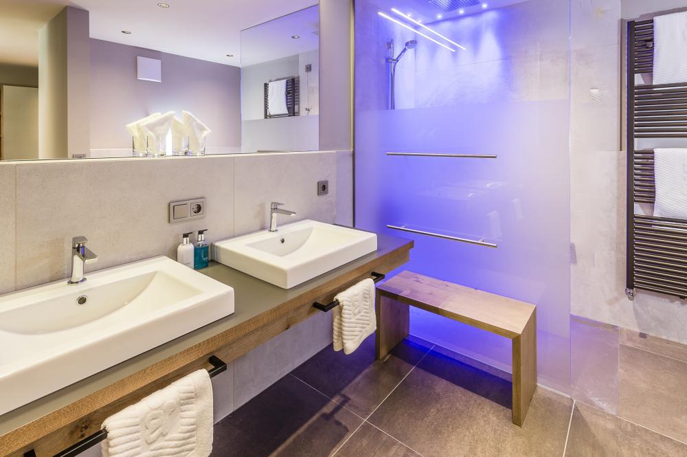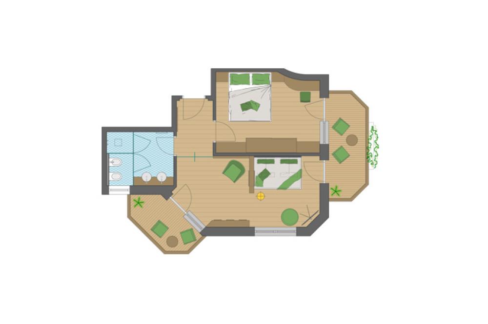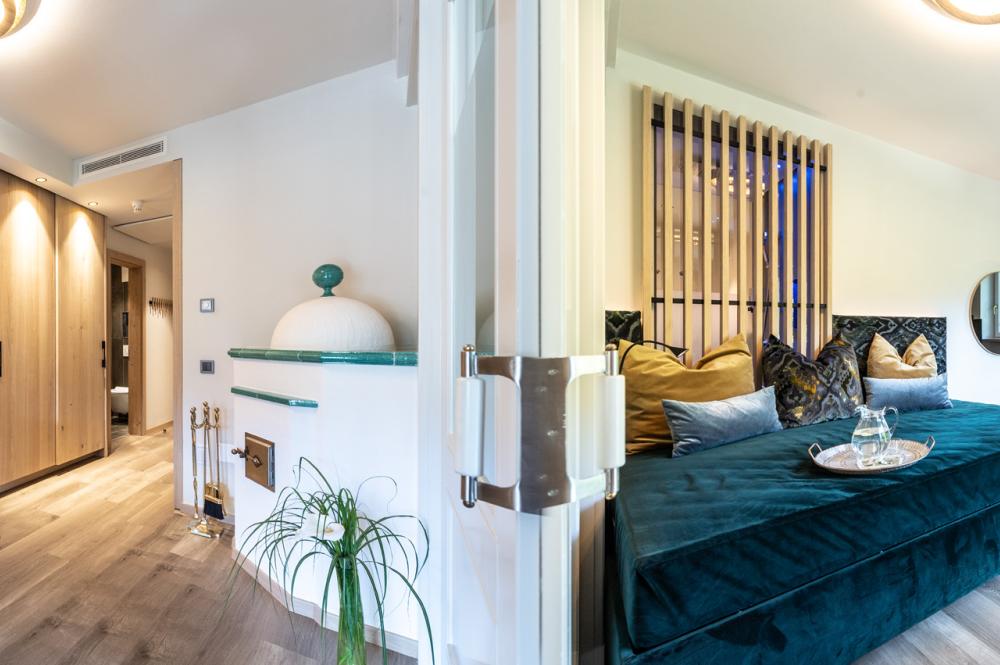 Moderne Juniorsuite in beruhigenden Naturfarben und heimischer Wildeiche mit Eichenholzboden. Harmonisches, naturbelassenes Design mit Klimaanlage, Minibar, SAT-TV, Telefon, Radiowecker, Zimmersafe und WLAN. Kuscheliges Kingsize-Bett und gemütlicher, nicht abgetrennter Wohnbereich mit Schlafcouch. Großzügiges, offenes Badezimmer mit geräumiger Regendusche, getrenntem WC und Bidet, komfortablem Doppelwaschtisch mit Föhn und Kosmetikspiegel. Großer Sonnenbalkon mit Blick auf die Gärten oder das Mendelgebirge. 2 Suiten barrierefrei.
