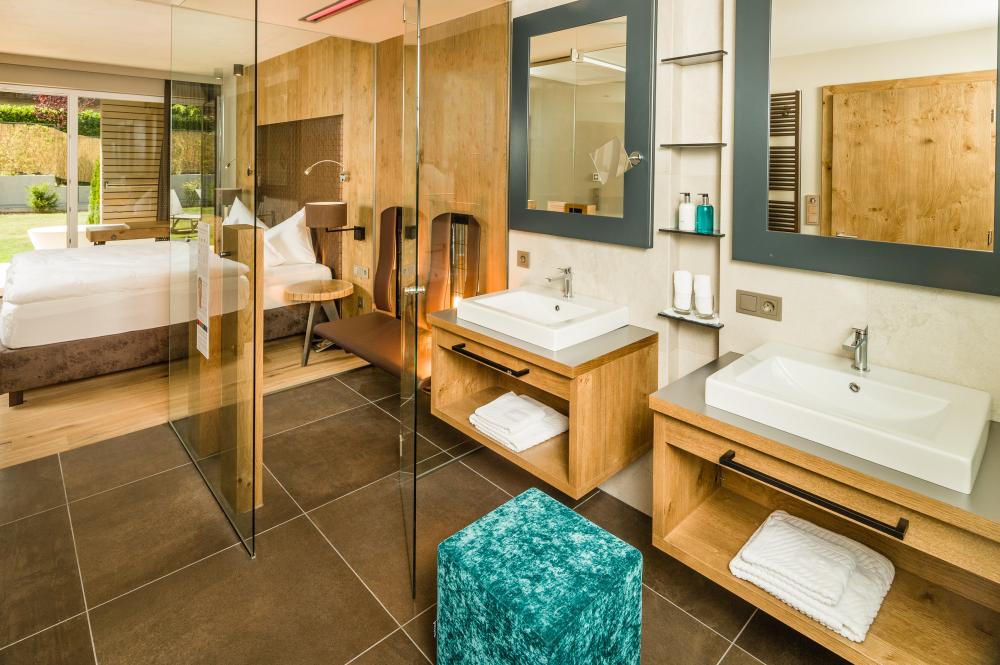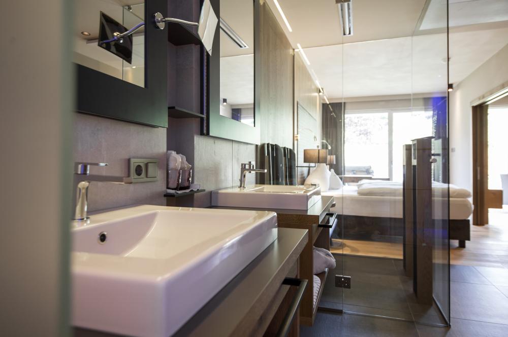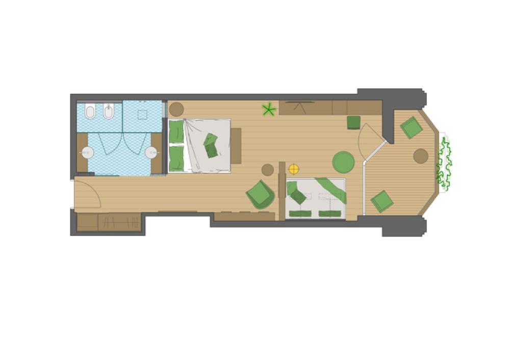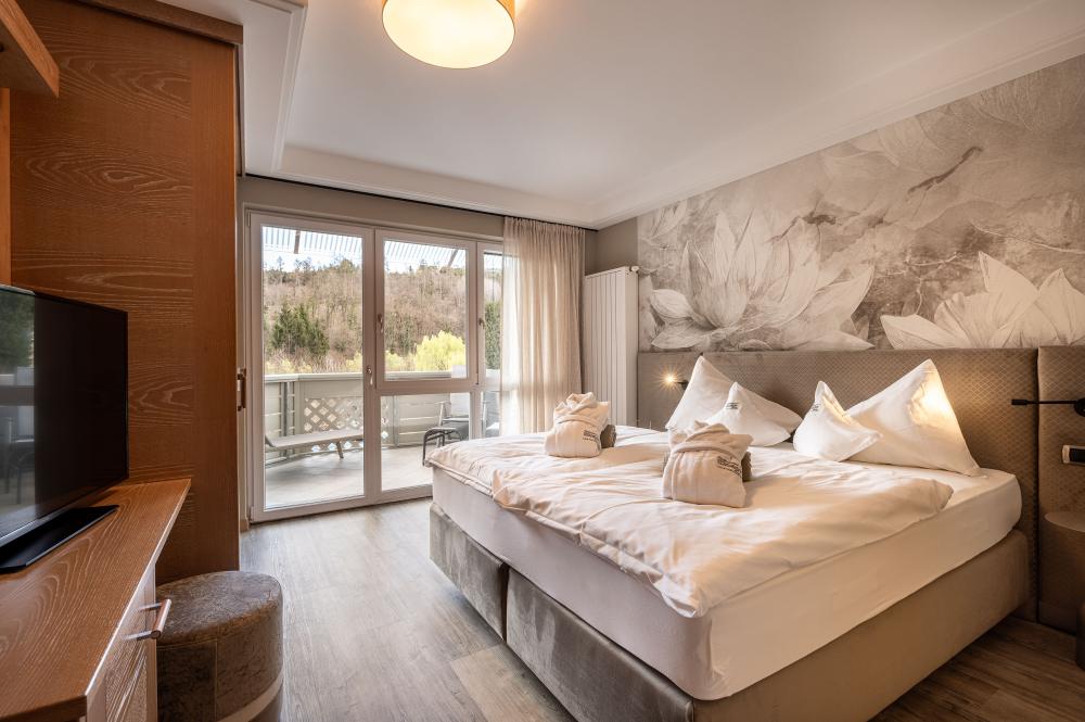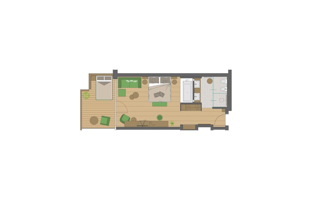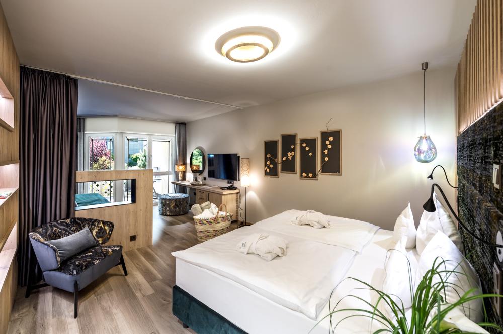 Modern Junior Suite in calming natural tones and local wild oak.Harmonious, natural design with air conditioning, minibar, SAT-TV, telephone, radio alarm clock, room safe, and Wi-Fi.Oak wood flooring. Cozy king-size bed and a comfortable, non-separated living area with designer couch. Spacious, open bathroom with a generous rain shower, separate toilet and bidet, comfortable double washbasin with hairdryer and makeup mirror.Large sun balcony with view of the gardens or Mendel Mountains.