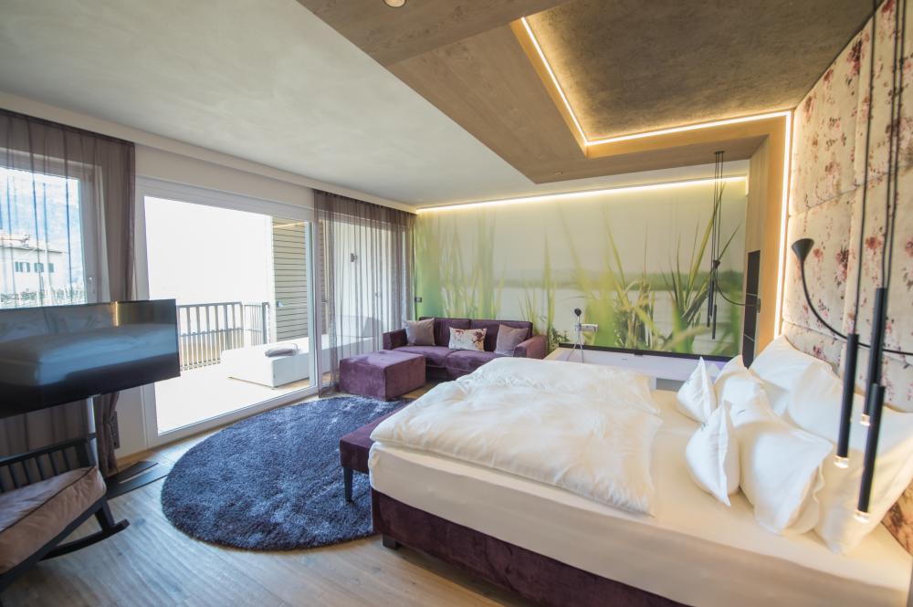 Family suite consisting of a bedroom with king-size bed, private bathroom with shower, infrared cabin, and separate toilet. Separated children bedroom with recliner chair for 2 persons (1.60 m wide queen bed), a single bed and e single couch, private bathroom with shower and toilet. Spacious living room with sitting area, mini kitchen and walk-in wardrobe. 1 extra small living-bedroom. WiFi available. This suite is located on the mezzanine floor above the Arbor Vitae sauna area and features a private covered terrace and large garden, a designer bath with light effects and nort-west-facing view to the fruit orchards and the Mendola/Mendel mountains. Dogs are not allowed.