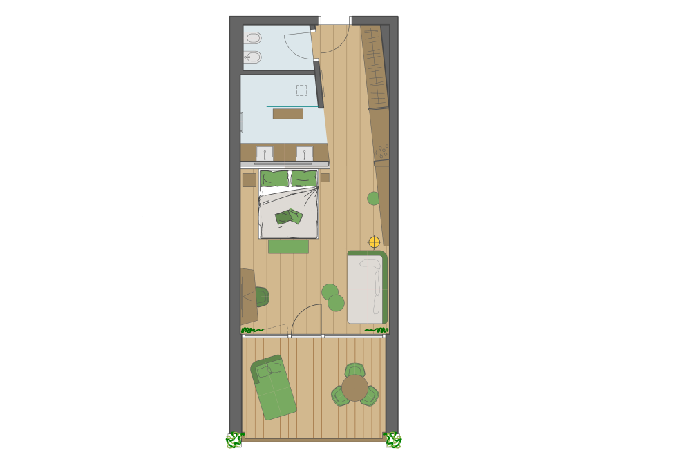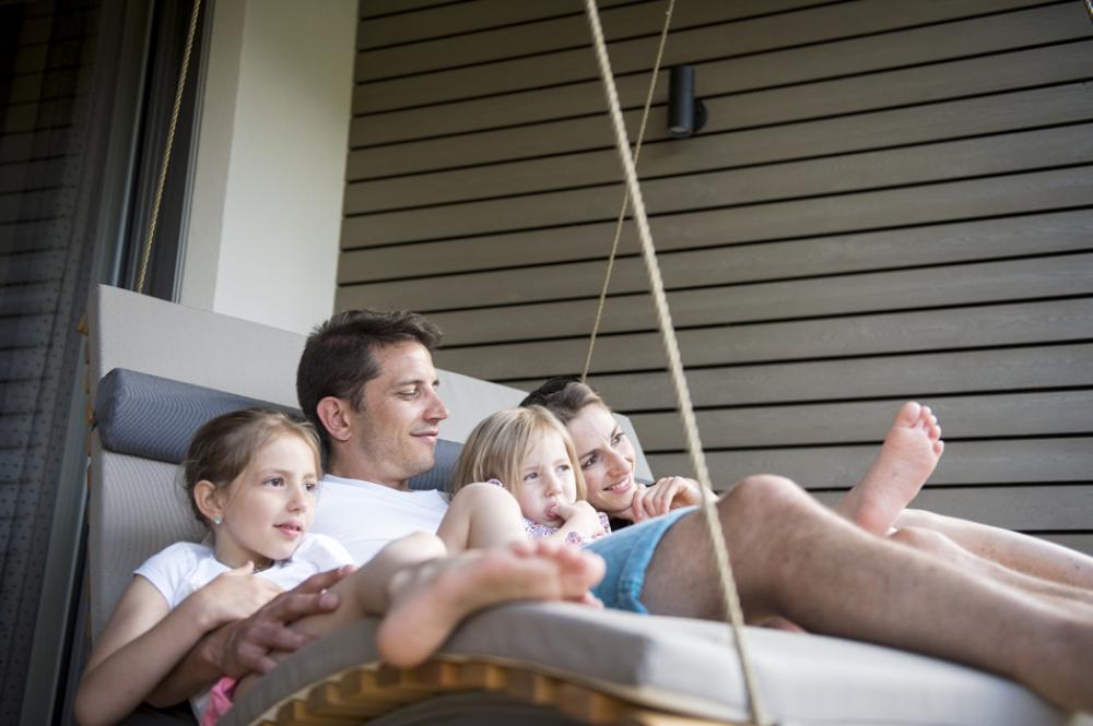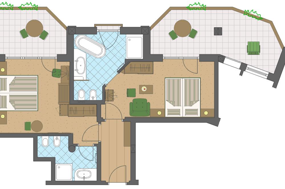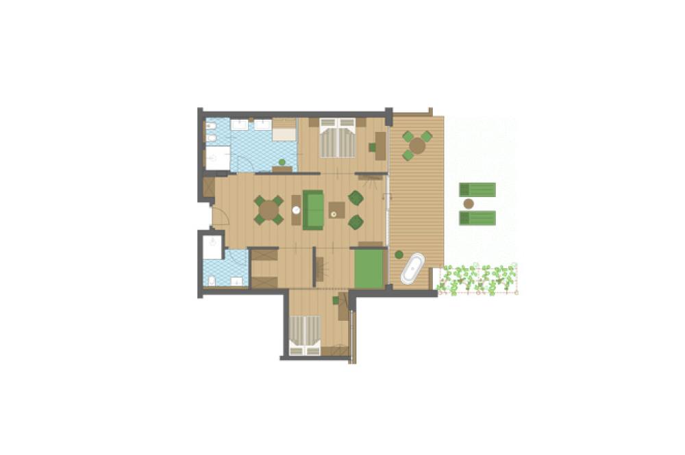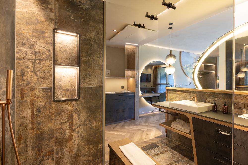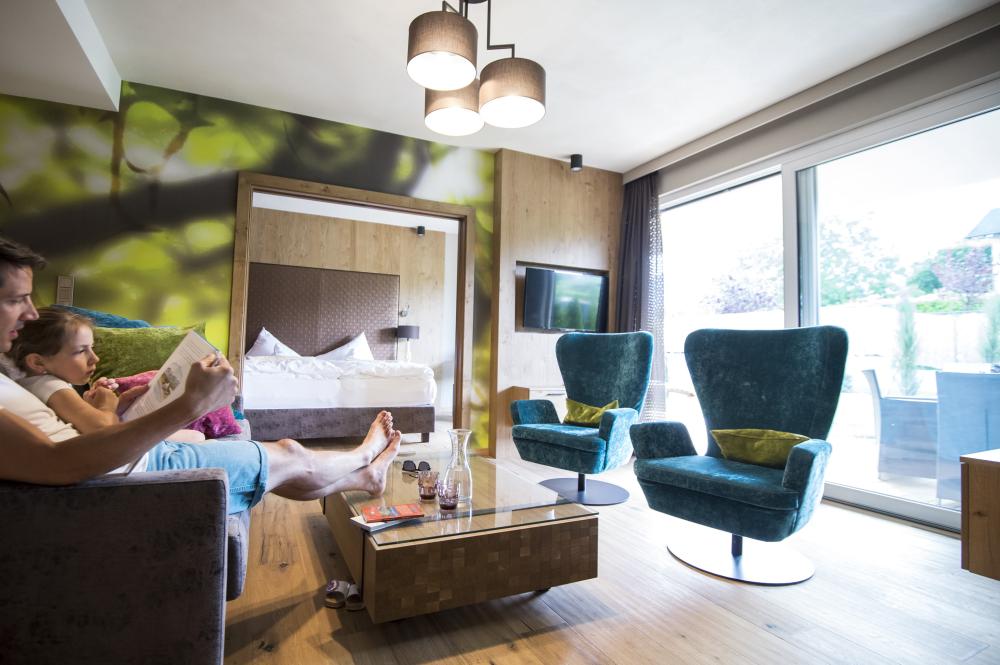 Approximately 48m2 + 30m2 Balcony | 2-4 personsBright Family Suite in modern design.Naturally finished furniture made of local wild oak with air conditioning, minibar, 2 SAT TVs, telephone, radio alarm clock, room safe, and Wi-Fi. Oak wood flooring.Separate sleeping area with a king-size bed and a separate living space with a cozy sleeping area.Spacious bathroom with a generous rain shower, separate toilet and bidet, comfortable double washbasin with a hairdryer and makeup mirror.Expansive sun balcony withView of orchards/vineyards and the Mendel Mountains. HIGHLIGHT: Jacuzzi whirlpool & private sauna.