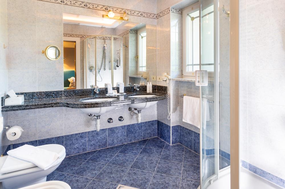 Family suite on garden side or west side consisting of a master bedroom with king-size bed, children's bedroom with fold-out queen bed and sofa bed, and a separate living room with seating area, minibar, satellite TV, telephone, radio alarm, safe, WiFi, and air conditioning. This suite features two bathrooms (one with shower, the other with bath, WC and bidet), with large granite sink unit, hairdryer and cosmetic mirror. Large, sunny balcony with hammock. Two of the Froschkönig suites are barrier-free.