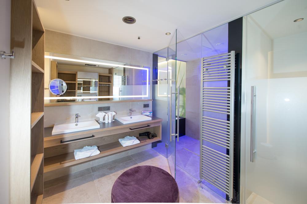Family suite with air conditioning and oak floor consisting of a bedroom with king-size bed with large, bright bathroom with infrared cabin, and separate toilet. Separated children bedroom with recliner chair for 2 persons (1.60 m wide queen bed), a single bed and e single couch, private bathroom with shower and toilet. Spacious, separate living room with sitting area, mini kitchen, walk-in wardrobe, and WiFi. This suite is located on the mezzanine floor above the Arbor Vitae sauna area and features a private covered terrace and large garden, a designer bath with light effects and west-facing view to the Mendola/Mendel mountains. Dogs are not allowed.