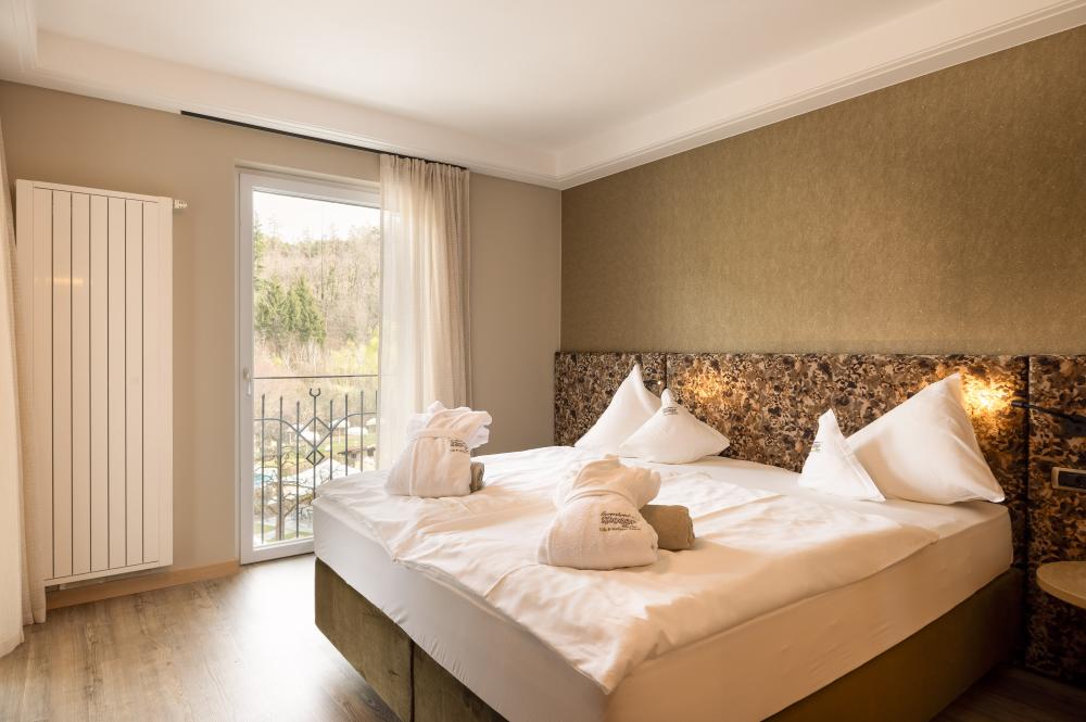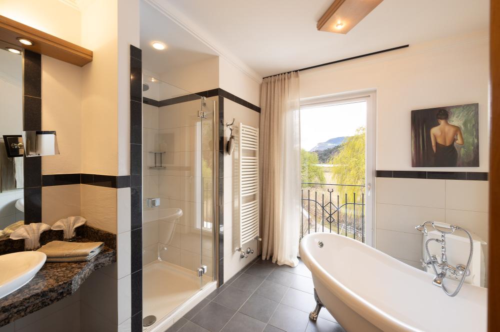 Double room furnished of local chestnut wood with kingsize bed, minibar, satellite TV, telephone, radio alarm, room safe, WiFi, air conditioning, large bathroom with extra-large shower and free-standing bath with panoramic view, separate WC and bidet, fine marble sink unit with hairdryer and make-up mirror. Sunny balcony with view over the vines and the Mendola/Mendel mountains.